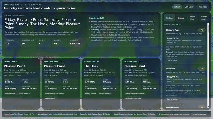 The dashboard ranks surf spots for the upcoming forecast windows and gives a practical “top call” for each day.
