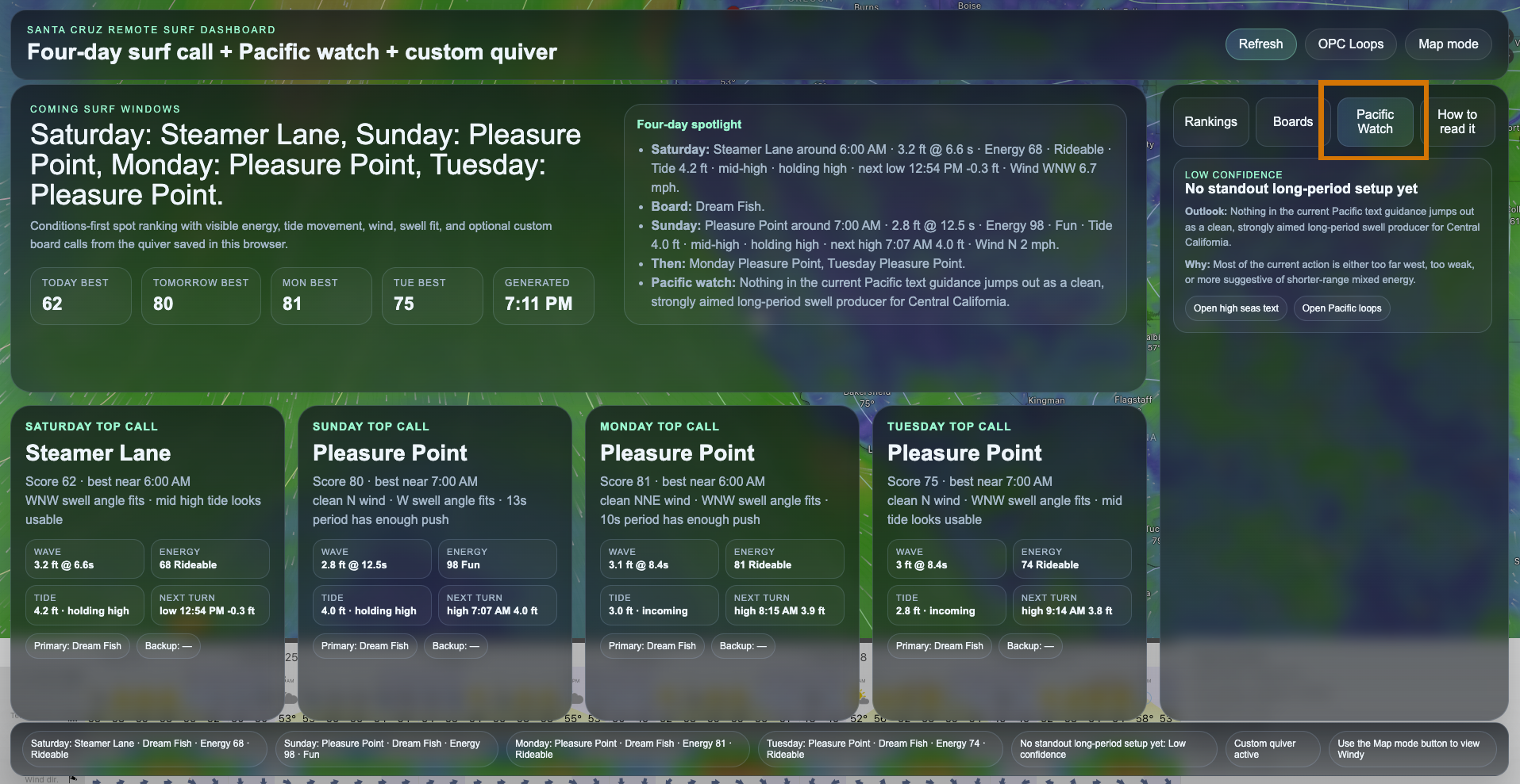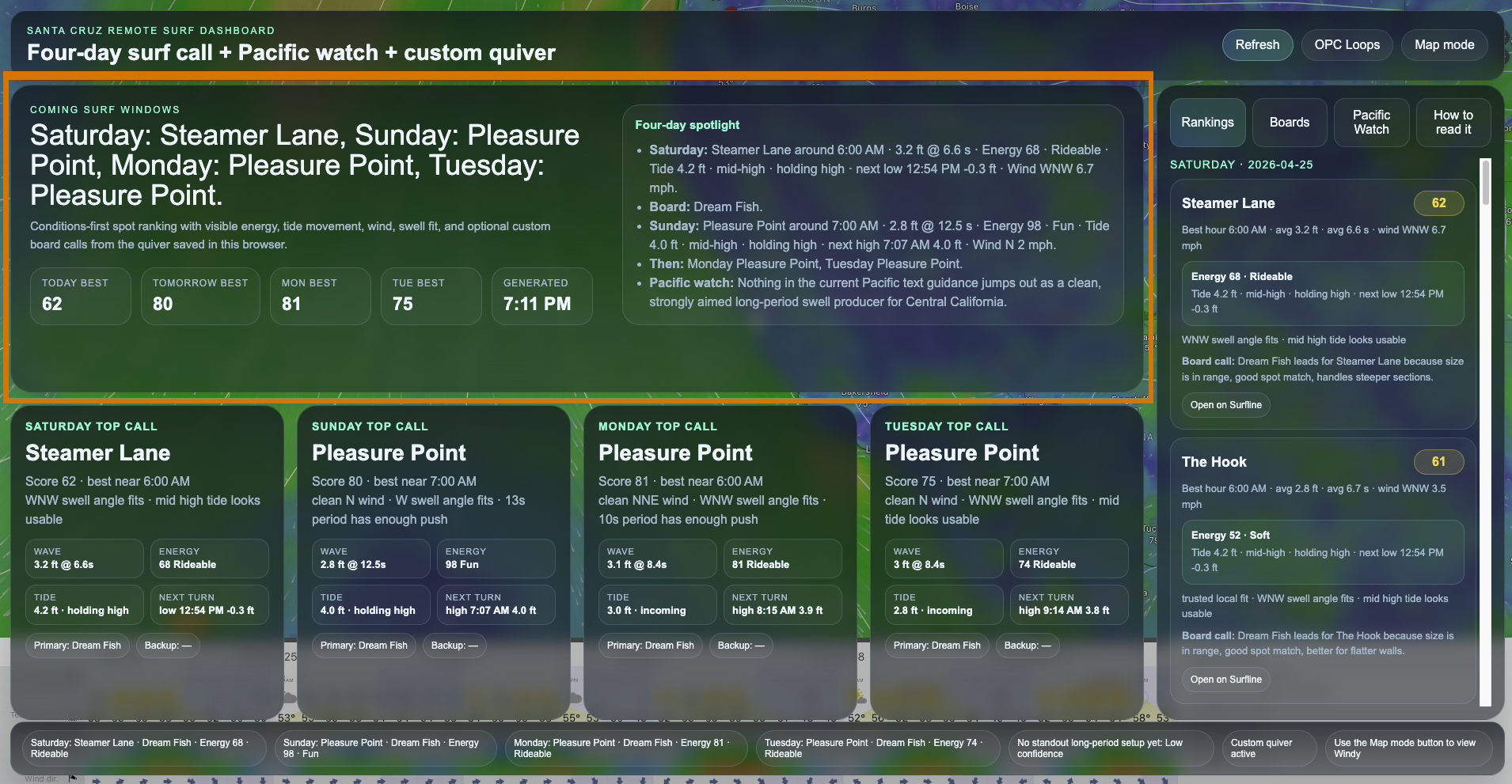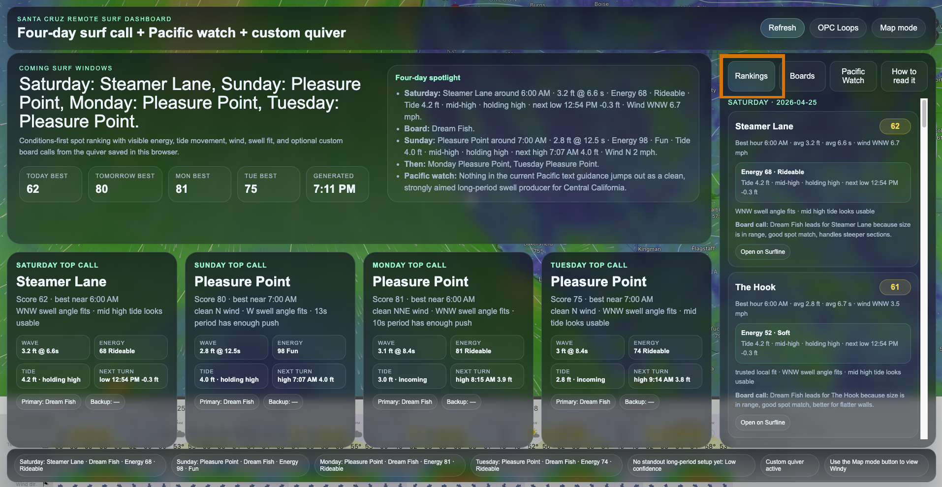 It combines forecast data, wind visualization, tide behavior, wave energy, spot ranking, and board recommendations into one tool.