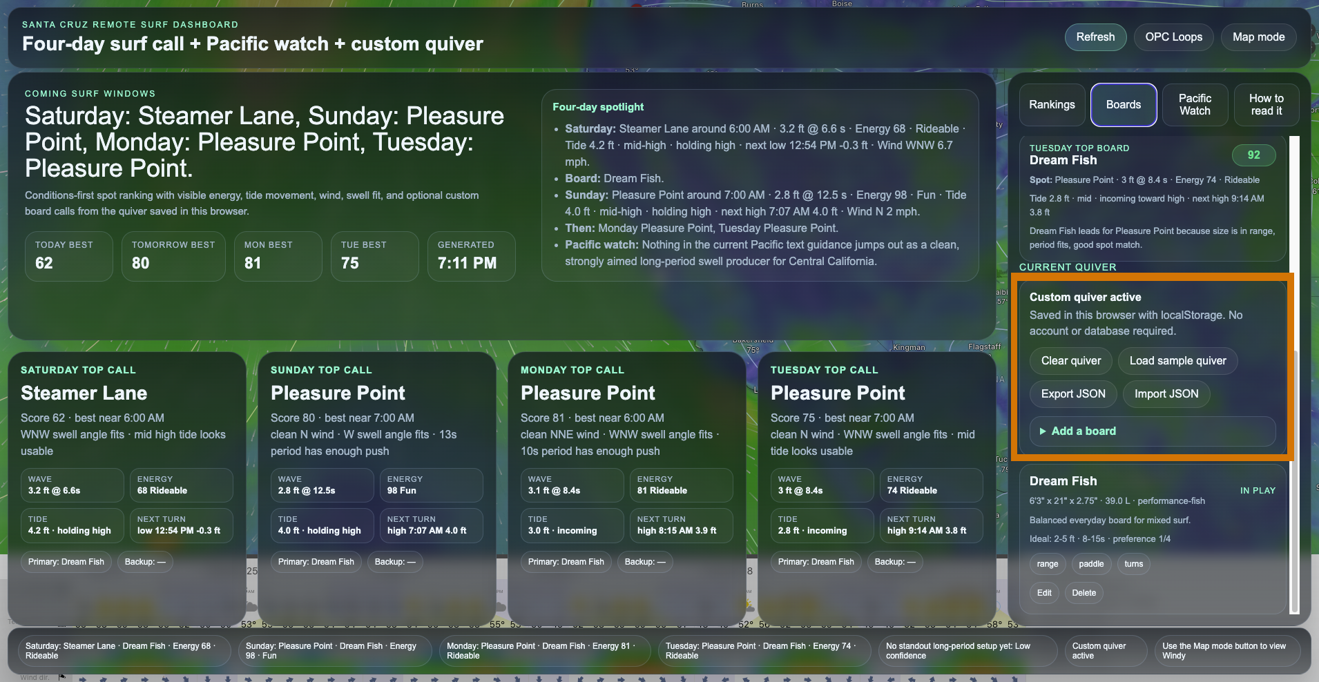 The most important feature is personalization. Once you add your own quiver, the dashboard becomes more than a generic forecast page. It becomes a custom surf decision tool built around the boards you actually ride.